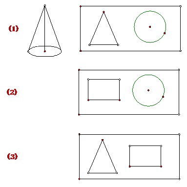 28、如图所示:(1)中左面的圆锥正好能通过右边图中的两个空洞。那么正好能通过(2)、(3)中右边图中两个空洞的,可能是什么立体图形?请画出草图。