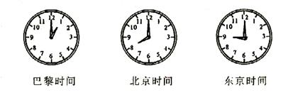 28. 同一时刻的北京时间、巴黎时间、东京时间如图所示。