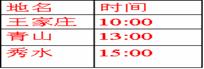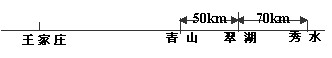 如图汽车匀速行驶途经王家庄、青山、秀水三地的时间如表所示,翠湖在青山、秀水之间,距青山50 km,距秀水70km,问王家庄到翠湖的路程有多远?(10分)