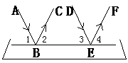 3、如图,一束平行光线AB与DE射向一个水平镜面后被反射,此时∠1 = ∠2,∠3 = ∠4,⑴ ∠1、∠3的大小有什么关系?∠2与∠4呢?⑵ 反射光线BC与EF也平行吗?