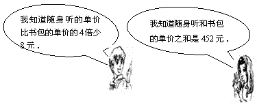 他们的对话内容(如图),求出他们看中的随身听和书包单价各是多少元吗?