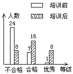 某校七年级全体320名学生在电脑培训前后各参加了一次水平相同的考试,考分都是以统一标准划分成“不合格”、“合格”、“优秀”三个等级(不合格即拿不到证书)。为了了解电脑培训的效果,用抽签方式得到其中32名学生的两次考试考分等级,所绘制的统计图如图所示。
