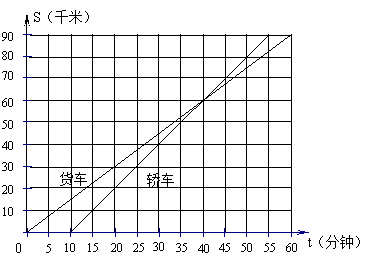 货车和轿车先后从甲地出发,走高速公路前往乙地. 上图表示行驶过程中,他们的行驶路程(千米)与所用时间(分钟)的关系的图象. 已知全程为90千米,根据图象上的信息填空: