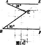 24、(6分)已知:如图(4),直线AE∥BF,∠EAC=28°,∠FBC=50°,求