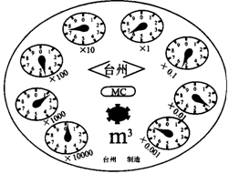 分析:要想正确读出水表的读数,首先要明确水表的结构.该水表共有八块表组成,每块表读数的意义不同,表下面1×10000表示读数1是10000立方米,同理1×1000表示读数1是1000立方米,1×0.1表示读数1是0.1立方米,在读每个表的数时只取整数.由此不难算出此水表的读数为