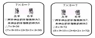 16. 法国的“小九九”从“一一得一” 到“五五二十五”和我国的“小九九”是一样的,后面的就改用手势了.右面两个图框是用法国“小九九”计算78和89的两个示例.若用法国“小九九”计算79,左右手依次伸出手指的个数是( )