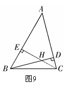 (本题10分)如图9,在△ABC中,∠A∶∠B∶∠C=3∶4∶5,BD,CE分别是边AC,AB上的高,BD,CE相交于点H.求∠BHC的度数.