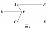 (本题10分)如图8,已知AB∥CD,F为AB,CD之间的一点,EF∥AB,请问:∠AFC,∠A和∠C之间有什么关系?请说明理由.
