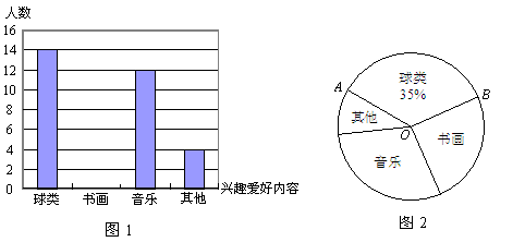 (2)在图2中,“球类”部分所对应的圆心角∠AOB=_______°,爱好“音乐”、“书画”、“其他”的人数所占的百分比分别为_________、_________、__________;