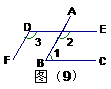 17.如图(9)所示,AB∥DF,DE∥BC,∠1=65°,求∠2,∠3的度数,并说明理由。