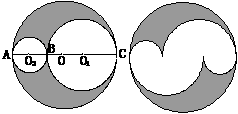 25.老师要小华用一张纸片制作成一个如图②的形状的图案,他是这样做的:先画一条线段AC(如图①),再以AC为直径画圆(O是它的圆心),并剪下这个圆,然后在AC上找一点B,再分别以AB、BC为直径画圆,然后用剪子或其它工具挖去这两个圆(即以O1、O2为圆心的圆),再通过适当的剪裁,就可以得到图②。