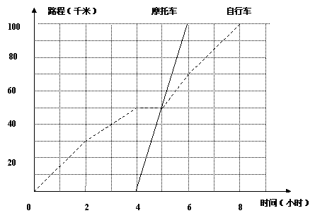 甲、乙两人(甲骑摩托车,乙骑自行车)从A城出发到100千米处的B城旅游,如右图表示甲、乙两人离开A城路程与时间之间的关系图象。