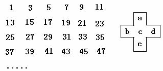 32、将连续的奇数1,3,5,7,…排成如下数字表,用十子框框出5个数,如右图所示。
