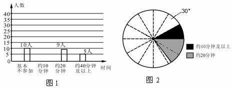 ⑶ 若该校七年级共有1200名同学,请你估计其中每天(除课间操外)课外锻炼时间不大于20分钟的人数,并根据调查情况向学生会提出一条建议.(注:图2中相邻两虚线形成的圆心角为30°)