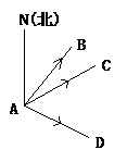 在飞机飞行时,飞行方向是用飞行路线与实际的南或北方向线之间的夹角大小来表示的.如图,用AN(南北线)与飞行线之间顺时针方向夹角作为飞行方向角. 从A到B的飞行方向角为35°,从A到C的飞行方向角为60°,从A到D 的飞行方向角为145°,试求AB与AC之间夹角为多少度?AD与AC之间夹角为多少度?并画出从A飞出且方向角为105°的飞行线.