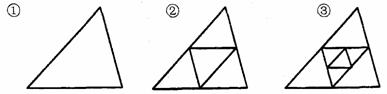 如图①所示的是一个三角形,分别连接这个三角形三边的中点得到图②,再分别连接图②中间的小三角形三边的中点,得到图③,按此方法继续连接,请你根据每个图中三角形的个数的规律完成各题。