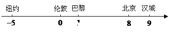 8.下图是5个城市的国标标准时间(单位:时)在数轴上的表示(例如:伦敦时间的0点是汉城时间的9点)。2008年8月第29届奥运会将在北京开幕,请问北京时间2008年8月8日20时应是( )