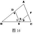 (本题7分)如图16,点D、E、F分别在AB、BC、AC上,且DE∥AC,EF∥AB,下面写出了说明“∠A+∠B+∠C=180°”的过程,请填空: