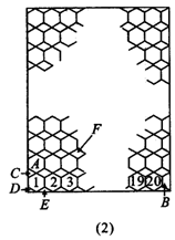 10.如图(2)所示,在大房间一面墙壁上,边长为15cm的正六边形A(如图(1))横排20块和以其一部分所形成的梯形B,三角形C、D、E,菱形F等六种瓷砖毫无空隙地排列在一起.已知墙壁高3.3m,请你仔细观察各层瓷砖的排列特点,计算其中菱形F瓷砖需使用( )
