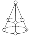 (8分)将1-5这五个自然数填入圆锥体中各圆圈内,使三条线段上三数之和、两圆周上三数之和都等于12.
