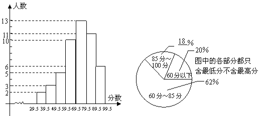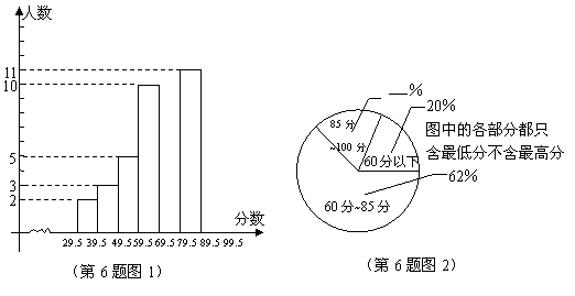 6. 七年级一班的两位学生对本班的一次数学成绩(分数取整数,满分为100分)进行了一次初步统计,看到80分以上(含80分)有17人,但没有满分,也没有低于30分的.为更清楚了解本班的考试情况,他们分别用两种方式进行了统计分析,如图1和图2所示.请根据图中提供的信息回答下列问题: