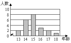 2. (08内蒙古赤峰市)如图是光明中学乒乓球队队员年龄分布的条形图.这些年龄的众数、中位数依次分别是( )