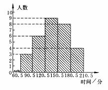 某研究性学习小组,为了了解本校初一学生一天中做家庭作业所用的大致时间(时间以整数记.单位:分),对本校的初一学生做了抽样调查,并把调查得到的所有数据(时间)进行整理,分成五个时间段,绘制成统计图(如图12-23所示),请结合统计图中提供的信息,回答下列问题.