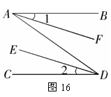 (本题10分)如图16,AB∥CD,需增加什么条件才能使∠1=∠2成立?(至少举出两种)