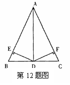 12. 如图,在△ABC中,D是BC的中点,DE⊥AB,DF⊥AC,垂足分别是E、F,BE=CF。