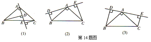 14.如图(1)所示,△ABC中,∠BAC=90°AB =AC,AE是过A的一条直线,且B、C在AE的异侧,BD⊥AE于D, CE⊥AE于E.