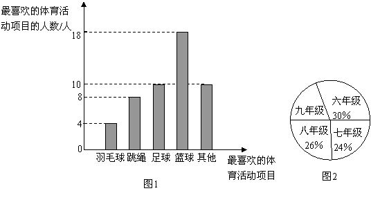 10、(2007哈尔滨)据2007年5月26日《生活报》报道,我省有关部门要求各中小学要把“每天锻炼一小时”写入课表.为了响应这一号召,某校围绕着“你最喜欢的体育活动项目是什么?(只写一项)”的问题,对在校学生进行了随机抽样调查,从而得到一组数据.图1是根据这组数据绘制的条形统计图.请结合统计图回答下列问题: