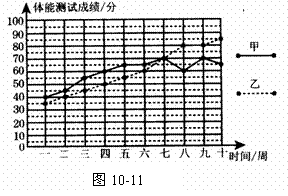 35.图10-11是连续十周测试甲、乙两名运动员体能训练情况的折线统计图.教练组规定:体能测试成绩70分以上(包括70分)为合格.