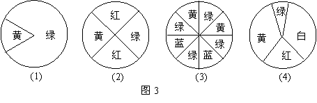 22、图3是几个转盘,若分别用它们作转盘游戏,你认为每个转盘转出黄色和绿色的可能性相同吗?若不同,哪个可能性大?