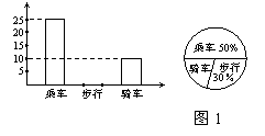 1、( 0 7 湖州)如图1是某班全体学生外出时乘车、步行、骑车的人数分布直方图和扇形分布图(两图都不完整),则下列结论中错误的是( )