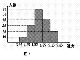 3、 (07义乌) 每年的6月6日是全国的爱眼日,让我们行动起来,爱护我们的眼睛!某校为了做好全校2000名学生的眼睛保健工作,对学生的视力情况进行一次抽样调查,下图3是利用所得数据绘制的频数分布直方图(视力精确到0.1).