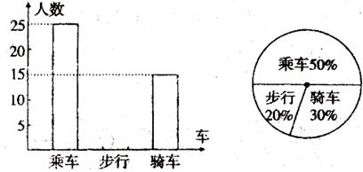 24、(6分)下图是某班学生上学的三种方式(乘车、步行、骑车)的人数分布直方图和扇形图.