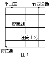 多年历史的古城扬州市区内的几个旅游景点分布示意图.(图中每个小正方形的边长均为