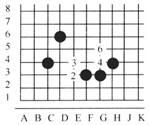 10.(2010江西)如图6-27,围棋盘的左下角呈现的是一局围棋比赛中的几手棋,为记录棋谱方便,横线用数字表示,纵线用英文字母表示,这样,黑棋①的位置可记为(C,4),白棋②的位置可记为(E,3),则黑棋棋⑨的位置应记为_____________.