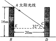 22、(8分)某房地产集团筹建一小区,居民楼均为平顶条式,南北朝向,楼高统一为16m(五层).已知该城市 冬至正午时分太阳高度最低,太阳光线与水平线的夹角为32°,如果南北两楼相隔仅有20m(如图所示), 试求: