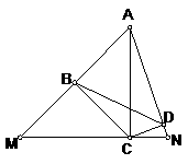 34、如图,四边形ABCD中,∠ABC = ∠ADC = 900,过点 C作MN⊥AC分别交AB、AD的延长线于M、N,试判断 ∠M与∠ADB有何关系?并证明你的结论。(6分)