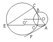 4、(新疆维吾尔自治区,1999)如图,⊙O和⊙O′相交于B、C两点,AB是⊙O的直径,AC是⊙O的弦,延长AB和AC分别交⊙O′于D、E连点,连DE,AF是⊙O′的切线,F为切点。若AF = ,EC = 5,DB∶BA = 1∶2。(1)∠BAC的度数;(2)求圆心距OO′的长;