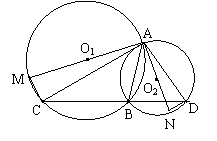 (泉州市,1997)如图,AB为⊙O1与⊙O2的公共弦,经过点B的直线和两圆分别相交于点C和D,AM、AN分别为⊙O1和⊙O2的直径。(1)求证:△AMC∽△AND;(2)设AC∶AD = 3∶2,AM + AN = 12,试分别求两圆的直径;