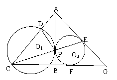 (潜江市,2001)如图,已知⊙O1与⊙O2外切于P,AB是两圆的内公切线,AE切⊙O1于E,EP的延长线交⊙O2于C,CF切⊙O1于F,交直线AE于G,交公切线于B,AC交⊙O2于D,连DP。(1)求证:CP·CE = CD·CA;(2)求证:AE 2