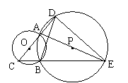 (西藏自治区,1998)已知:如图,A、B是⊙O和⊙P的交点,AC是⊙O的直径,D、E分别是CA、CB的延长线与⊙P的交点,AC = 2,BC = AD = 1。(1)求∠C的度数;(2)求CE的长;(3)求证:BD = ;