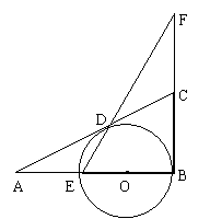 (江西省,1997)如图,在△ABC中,∠B = 90°,O是AB上的一点,以O为圆心,OB为半径的圆与AB交于E,与AC切于点D,直线ED交BC的延长线于F。(1)求证:BC = FC;(2)若AD∶AE = 2∶1,求cot∠F的值;