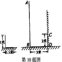 如图,一电线杆AB的影子分别落在了地上和墙上,某一时刻,小明竖起1米高的直杆,量得其影长为0.5米,此时,他又量得电线杆AB落在地上的影子BD长3米,落在墙上的影子CD的高为2米。小明用这些数据很快算出了电线杆AB的高。请你计算,电线杆AB的高是多少?(5分)
