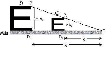 23、[2005佛山中考题] 如图,在水平桌面上的两个“E”,当点P1,P2,O在一条直线上时,在点O处用①号“E”测得的视力与用②号“E”测得的视力相同.