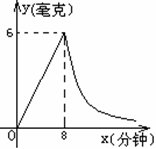18、为了预防“非典”,某学校对教室采用药熏消毒法进行消毒. 已知药物燃烧时,室内每平方米空气中的含药量y(毫克)与时间x(分钟)成正比例,药物燃烧后,y与x成反比例(其图象如图所示). 观察得药物8分钟燃毕. 此时室内空气中每立方米的含药量为6毫克,请根据题中所提供的信息,解答如下问题:
