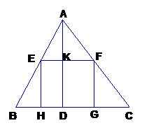23、如图△ABC是一锐角三角形余料,边BC=16cm,高AD=24cm,要加工成矩形零件,使矩形的一边在BC上,其余两个顶点E、F分别在AB、AC上。