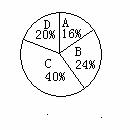 13.如图,是某班一次数学考试成绩等级分布扇形统计图, A表示优秀率,B表示良好率,C表示中等率,D表示不及格率,如果该班有学生50人,则在这次考试中:优秀的有____人,良好的有_____人,中等的有_______人,不及格的有________人.